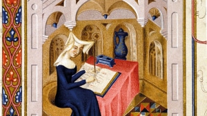 Christine de Pizan occupée à écrire dans son cabinet de travail